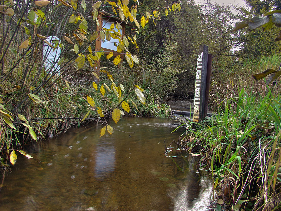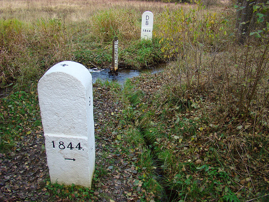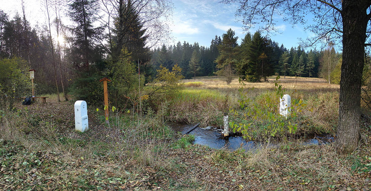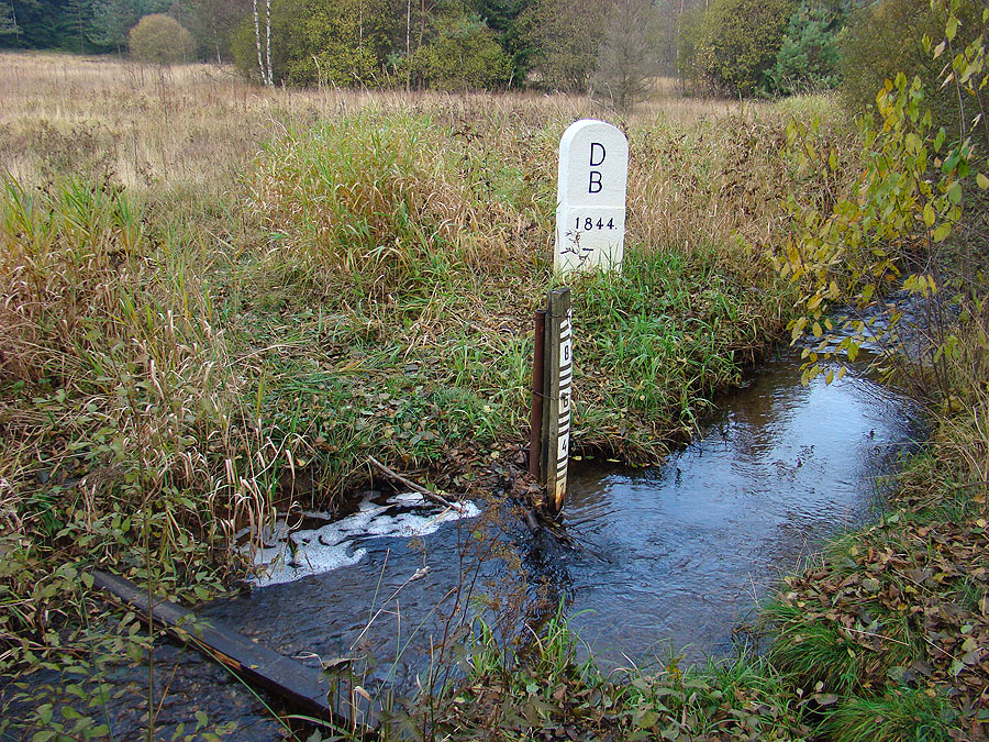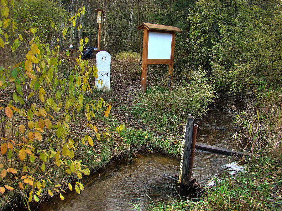 areál nejzápadnějšího bodu ČR český hraniční kámen (v popředí) na břehu Újezdského potoka německý limnigraf, v potoce leží nejzápadnější bod ČR hraniční kameny (v popředí německý) na břehu Újezdského potoka