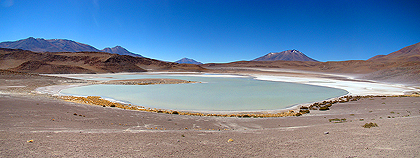 zelenavá laguna Verde (4324m) a uprostřed vulkán LIcancabur (5868m)