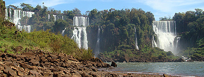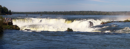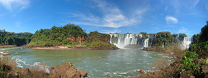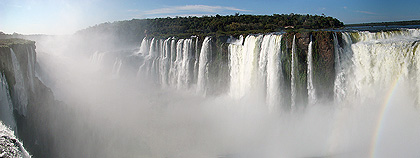 Malé 150° panorama je složené z pěti fotografií. Zobrazuje pohled do severní části vodopádů Iguazú, která se nazývá Ďáblův chřtán. |